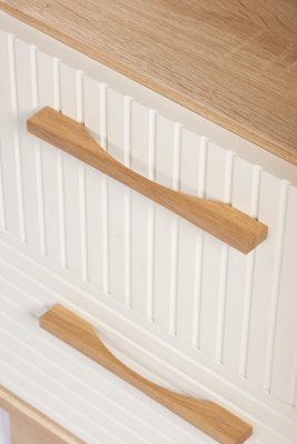 Створки крепятся на петли с доводчиками для плавности хода. Конструкцией предусмотрен механизм открывания створок «push-to-open». Ручки ящиков из натурального массива дуба.