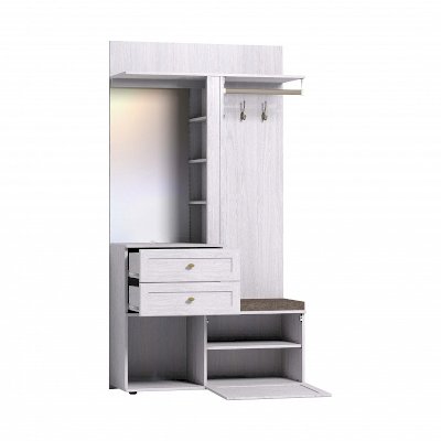 В модуле предусмотрено место для хранения коробок и домашней обуви — просторная открытая ниша и ниша с полочкой за откидной дверцей на шарнирах. Дверца дополнительно фиксируется при закрывании магнитной защелкой. Регулируемые опоры помогут компенсировать неровный пол в прихожей. Ящик под аксессуары и косметику оснащен шариковыми направляющими полного выдвижения, что увеличивает полезную площадь ящика. Мягкое сидение, которое входит в комплектацию модуля, позволит обуваться с комфортом и сэкономить место в прихожей. Сборка Шкаф МЦН универсальная — его можно собрать как на правую, так и на левую сторону.