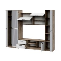 • Гостиная состоит из трёх модулей (шкаф платяной, шкаф бельевой, средняя секция), которые при желании можно устанавливать отдельно друг от друга, размещая в разных комнатах