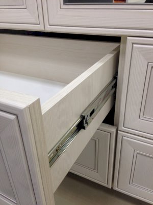Для полного погружения в классический стиль производитель создал серию «Венеция» не только в гостиной, но и в спальне, и в прихожей. На выдвижных ящиках используются шариковые направляющие полного выдвижения, которые обеспечат не только плавность хода, но и надежность, и тишину. Теперь не стоит переживать из-за неровности поверхности пола. Регулируемые опоры придают мебели хорошую устойчивость и при желании регулировку высоты.